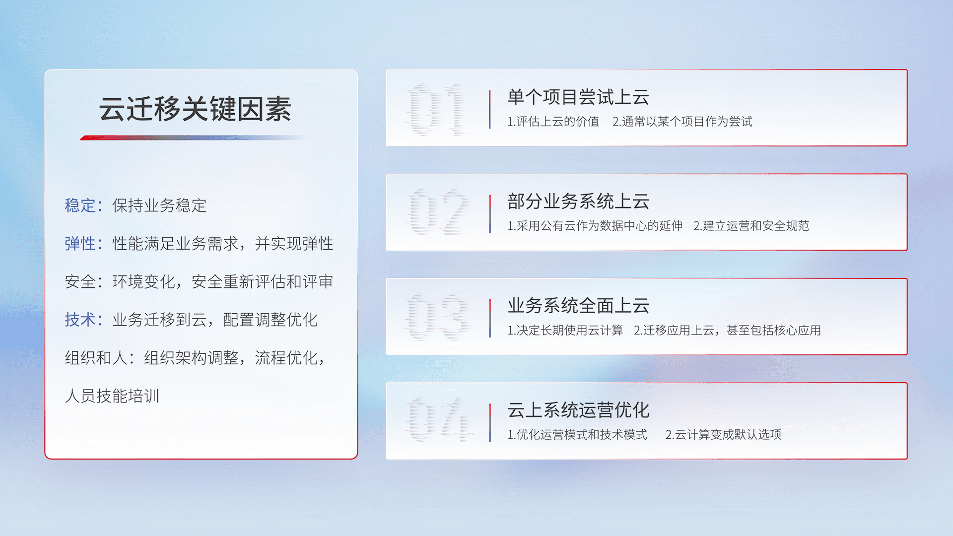 结合实际业务,,从规划设计、、、云平台选型、、云原生改造、、、数据迁移、、、、集成交付,,迁移全过程为客户识别最佳上云路径,,,做好风险识别管理,,,,设计网络架构、、身份权限、、、、安全审计合规、、、操作审计、、、、日志审计、、监控告警策略、、多站点容灾设计等,,对云上基础设施进行整体规划,,,,提升IT治理水平,,,以满足弹性、、、高可用、、高性能的需求。。。。