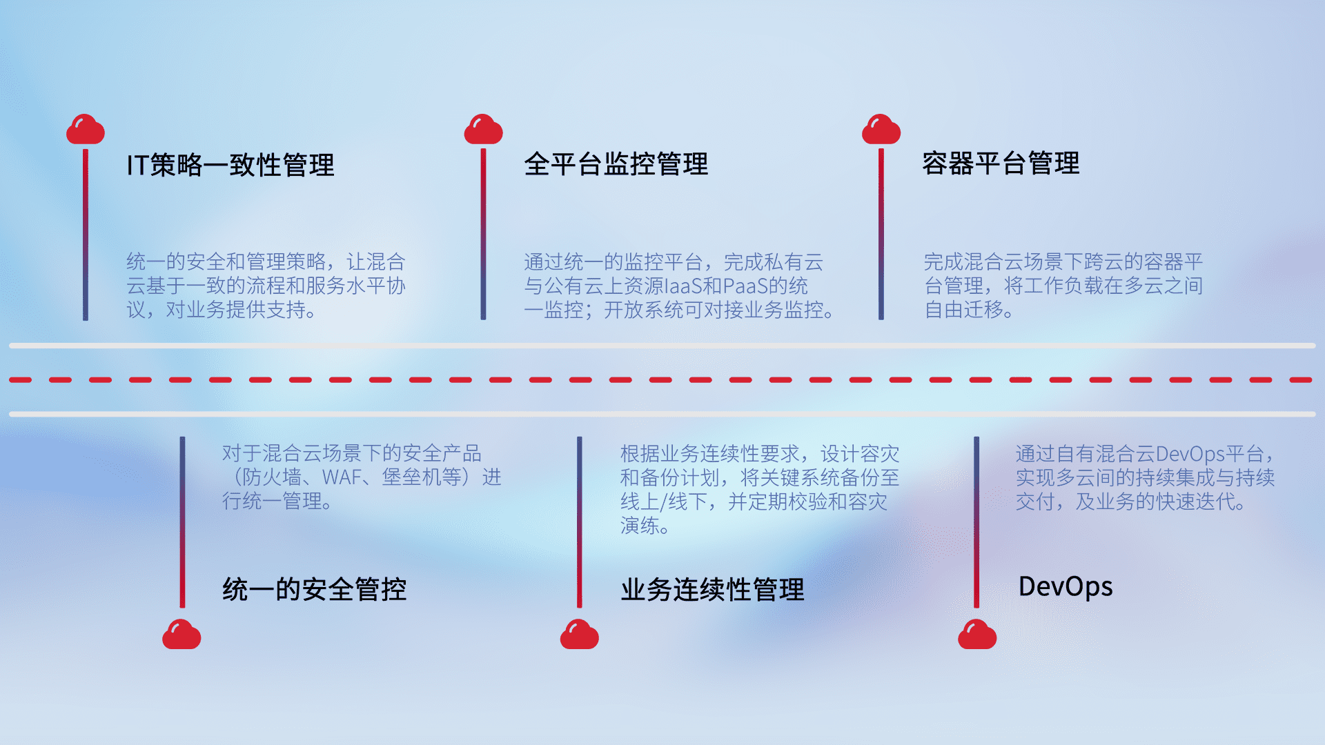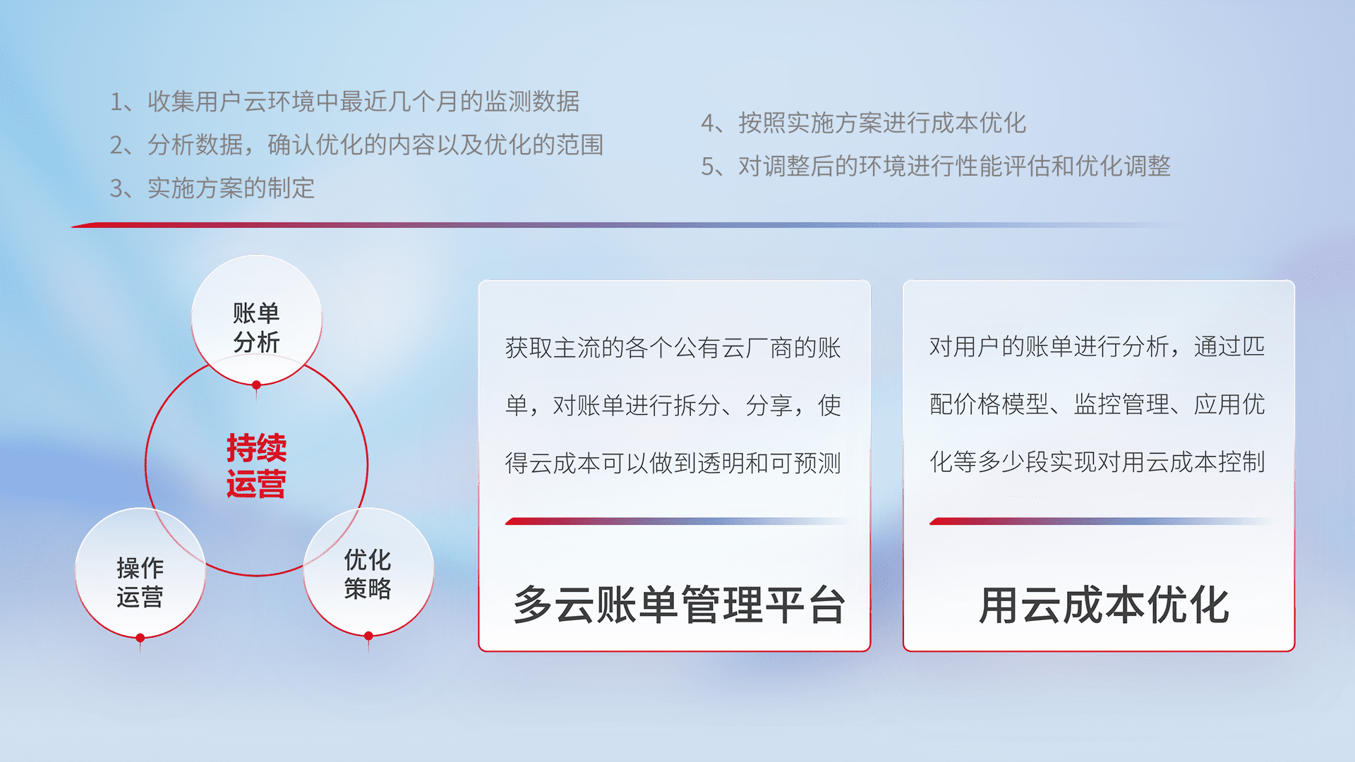 通过多云纳管,,,,以统一的资源数据模型把客户的云资源进行抽象和封装,,,,进而实现对多云资源的统一操作,,,保障云资源管理的可靠性、、稳定性与可用性。。量身定制化运维内容,,配置、、、开发运维、、、、补丁管理、、备份、、、监控、、认证和访问管理、、审计和日常巡检等,,,,保障在用云过程中的可靠度,,稳定度以及高可用率。。。