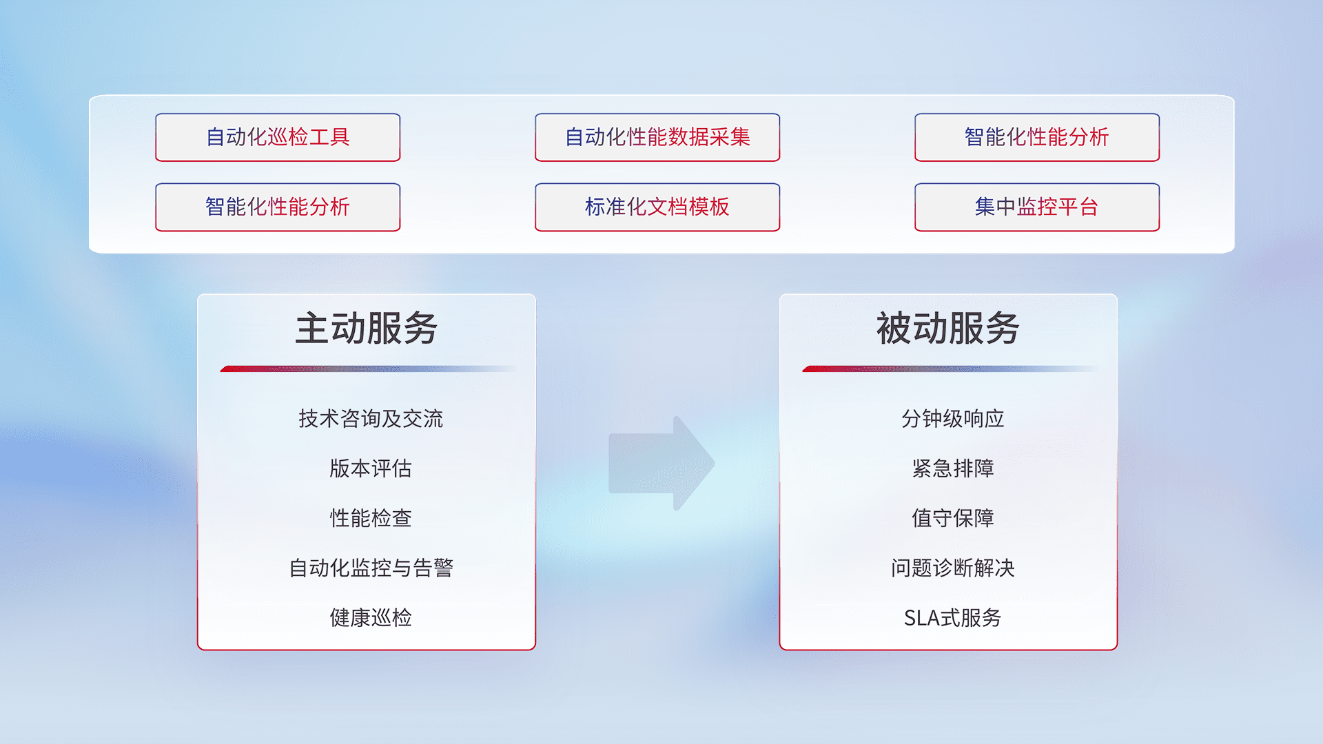 智能化工具和标准化文档,,,,保障服务质量,,,,提供主动服务(包含技术咨询、、、、版本评估、、性能检查、、、自动化监控与告警、、、健康巡检)和被动服务包含(分钟级响应、、、、紧急排障、、、、值守保障、、、问题诊断解决、、SLA服务)。。。